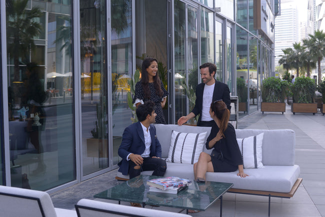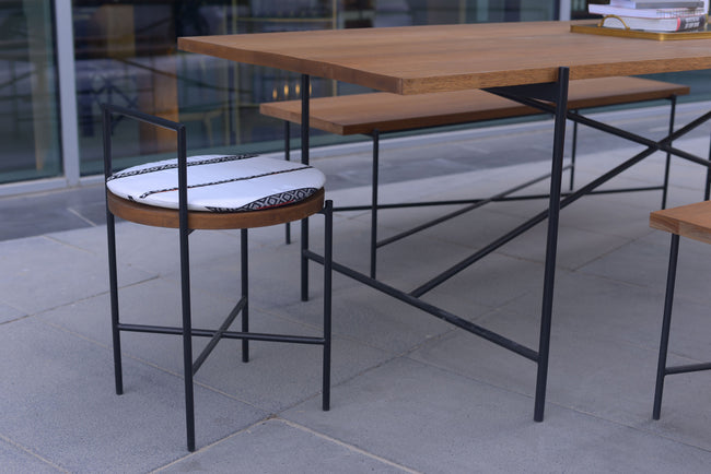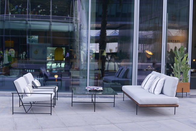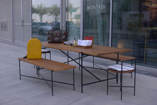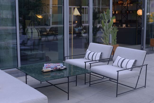 The Modern Bedu Collection is a collaboration between The Line Concept and Montroi. It is centered around modernizing the traditional, while highlighting Montroi’s philosophy on modern nomadic life. The collection explores the juxtaposition of the modern nomad, and the traversion in life and travel between developed cities of concrete, steel and marble, and the traditional Bedouin nomad, through the fabrics and seating traditionally used in their tribes. We have reinvented the “majlis”, a place of gathering, seating and tea-drinking using light “pencil-line” steel frames combined with the Sadu fabric renowned in the Arabian tribes to define the Modern Nomad. The steel frames are made to look like hand-drawn “pencil-lines”, to recreate the idea of light and movable objects, while highlighting an important part of traditional nomadism, recording the journey, highs and lows, excitements and perils, in pencil. The green marble reflects the elements of greenery in both a barren desert or a concrete jungle, as do the live cactuses used to complement this presentation.